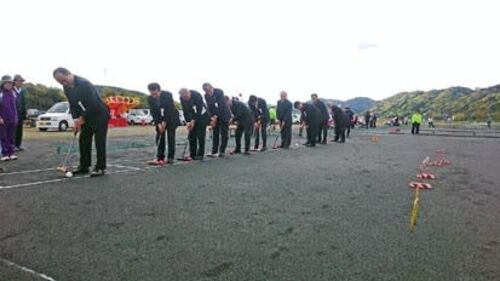 来賓らで始球式 選手宣誓する中村文哉さん 本社主催、御坊市・日高郡両ゲートボール協会主管の創刊70周年記念第23回紀州新聞社旗日高地方ゲートボール大会=大会長・源地温勇紀州新聞社代表=は11日、「エンジョイ・スパーク」を合言葉に御坊市野口専…