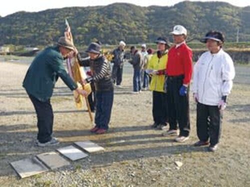 優勝旗を受けるゆずチーム 準優勝盾を受ける本ノ脇チーム 本紙創刊70周年記念第23回紀州新聞旗日高地方ゲートボール大会は11日、御坊市野口専用ゲートボール場に43チームが出場して開き、決勝戦で那智勝浦町・串本町の合同チーム「ゆず」が、本ノ脇…