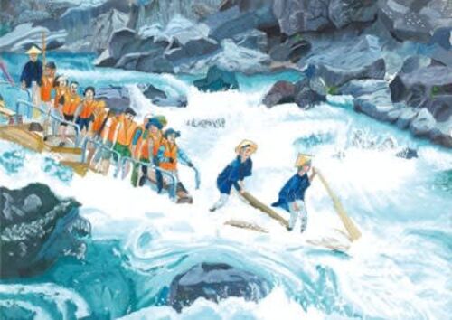 中学生部門で最優秀賞を獲得した中津さんの作品「北山川観光筏下り」 県と県河川協会主催の第24回きのくに川の日2022絵画コンクールの入賞者が発表され、北山村の観光筏下りを力強く描いた日高中2年の中津凛香さんが中学生部門で最優秀賞を受賞した。…