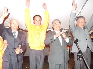 午後5時過ぎに伊勢屋倉庫(小竹八幡神社前)の選挙事務所に無投票当選の知らせが届くと、詰めかけた支持者から歓声と拍手がわき起こり、中村氏は「皆さんのおかげ」と笑顔で応じ、万歳三唱などで当選の喜びを分かちあった。