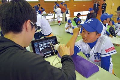 エコー診断では、スポーツドクターや理学療法士ら10人が一人ひとりのひじの状態を調べた。投げ過ぎると、ひじにストレスがかかりはく離骨折などにつながるという。ひじを曲げたり、伸ばしたりしたあと、エコーで確認。病院でのMRI検査が必要な子どもやこのままでは後遺症が残る可能性のある子もいた。印南黒潮の湯川弘監督は「こんなに子どもたちのひじに負担が掛かっているとは思わなかった。きっちり調べてもらい感謝している。とてもいいきっかけになったので今後、より一層注意を払っていきたい」と話した。