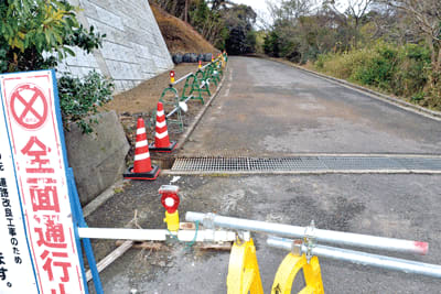 昨年度は設計を行い、今年度から着工。今年度は県道西側の進入路から45メートルの区間で一部山切する拡幅工事に取り組みこのほど完了。来年度から本格的な拡幅工事に入ることにしており、総事業費は約7億円を見込み、令和6年度中の完成をめざしている。宅地化をさらに促すため未来投資事業で水道管を敷設するインフラ整備にも着手した。