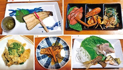 (つきだし、アユの刺身、ウナギの白焼き、コイの甘辛煮、天ぷら)