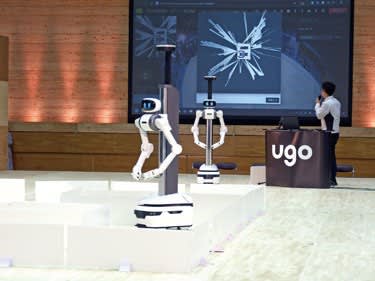 国内の研究機関や大学・企業の最先端ロボットを招く「スーパーロボットショー」に参加したugo(株)からは警備や監視、点検など様々な作業を遠隔化・自動化で行う業務DXロボット「ugo Pro(ユーゴープロ)」と「ugo mini(ユーゴーミニ)」が参加。ステージの実演では、来場した子どもたちの質問に答えたり、迷路を歩き回って地図を作り、障害物があれば迂回路を考える機能などを披露。ブース展示でも人気を集めた。